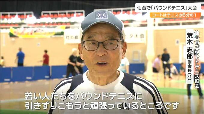 仙台市泉総合運動場体育館で開かれた大会には、50代から80代までおよそ100人のプレーヤーが宮城県内外から参加しました。バウンドテニスは、テニスコートのおよそ6分の1のコート内で、ネットの高さと同じ長さおよそ50センチのラケットを使ってゴム製のボールを打ち合います。