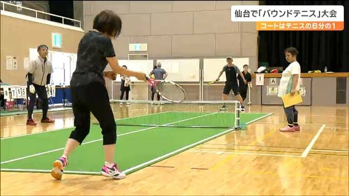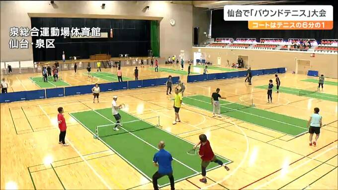テニスコートの6分の1の広さでプレーする「バウンドテニス」の大会が仙台市内の体育館で開かれました。