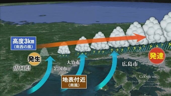 この時に発生した線状降水帯は、加藤さんをして「本当に典型的な教科書に載せたいレベル」と言わしめ、幅20~30キロ、長さはおよそ100キロ。山口と広島の県境付近で発生した積乱雲が次々と北東方向へ移動して連なり、個々の積乱雲はいずれも被災地の上空で発達のピークを迎えた。結果、猛烈な雨が同じような場所で降り続き、被害はせまい範囲に集中することになった。