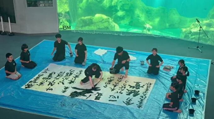 のとじま水族館で書道のパフォーマンスを行ったのは、東京にある大東文化大学の書道部の学生たち。大きな水槽を背に設けられた特設ステージ。