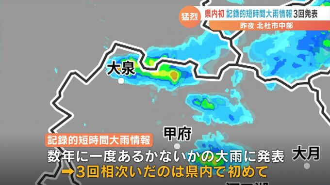 この情報は数年に一度あるかないかの大雨に発表されるもので、3回相次いだのは山梨県内で初めてです。