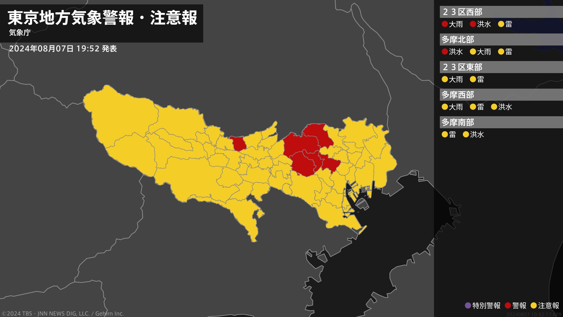 気象台は、午後7時52分に、洪水警報を新宿区に発表しました。また大雨警報(浸水害)を中野区、杉並区に発表しました。