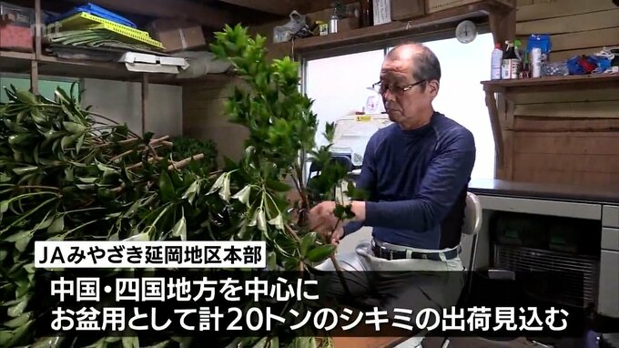 お盆を前に宮崎県延岡市北川町では、供え物などに使われる「シキミ」の出荷がピークを迎えています。仏壇やお墓の供え物に使われる「シキミ」。県内有数の生産地、延岡市北川町では、43戸の農家がシキミを栽培して…