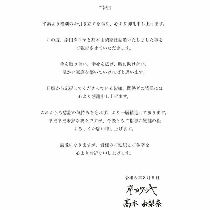 インスタグラムには、岸田さんと高木さんが連名の文書がアップされ「この度、岸田タツヤと高木由梨奈は結婚いたしました事をご報告させていただきます。」と、投稿。