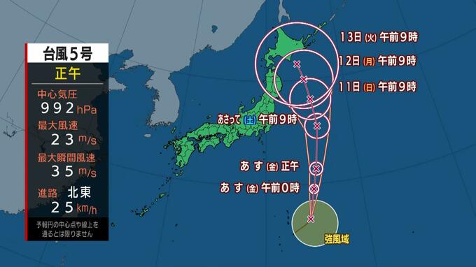 現在の予想では、9日から11日にかけて北へ向かう台風5号は、12日午前9時には速度が「ゆっくり」となり、その後13日午前9時には、進路を「北北西にかえて」ゆっくり進む可能性があるとされています。まだブレは大きいものの、進路の先には東北地方や北海道があり、最新の情報に注意が必要です。