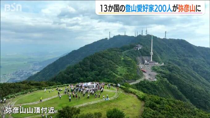 8月11日の「山の日」を前にした7月25日、アジア13か国の登山愛好家200人が弥彦山に集まり、夜には“たいまつ”を持って温泉街を練り歩き、登山の安全や自然保護へ願いを込めました。