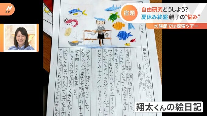 絵日記には、さまざまな魚の中で、翔太くんがエサをやる姿。宿題を終わらせるとともに、思い出にも残る体験ができたようです。