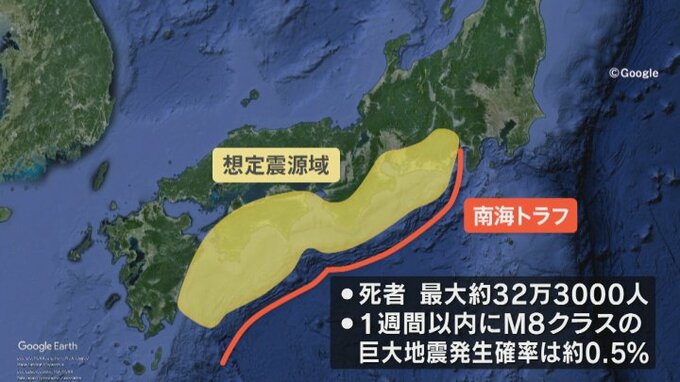 南海トラフ地震は東海沖から九州沖の海底の地形に沿って発生する地震で、最悪の場合およそ32万3000人の死者が想定されています。