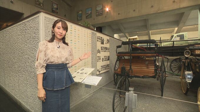 「日本は人力車や馬で移動していた明治時代。世界で初めて作られた自動車がベンツ1号車です。馬車のように見えますがガソリンを燃料に走行します。時速は15㎞。小走りくらいの速さだということです」
