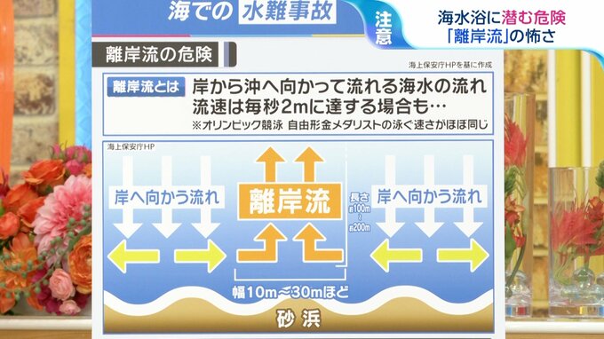 離岸流は岸から沖へ向かって流れる海水の流れで、流速は毎秒2mに達する場合もあります。