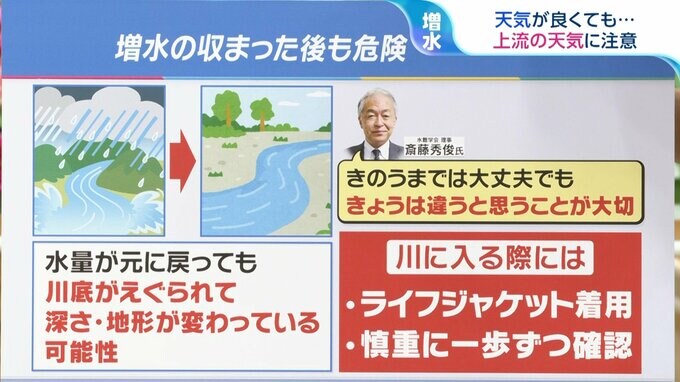 頭上が晴れていても上流で雨が降っていると川は増水しますから、天気予報ももちろん事前にご覧いただきたいし、スマホのアプリなどでも雨雲がわかるようになっていますから利用して用心していただきたいです。