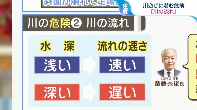 水深が「浅い」ところは流れが速く、「深い」ところは川の流れが遅くなっています。