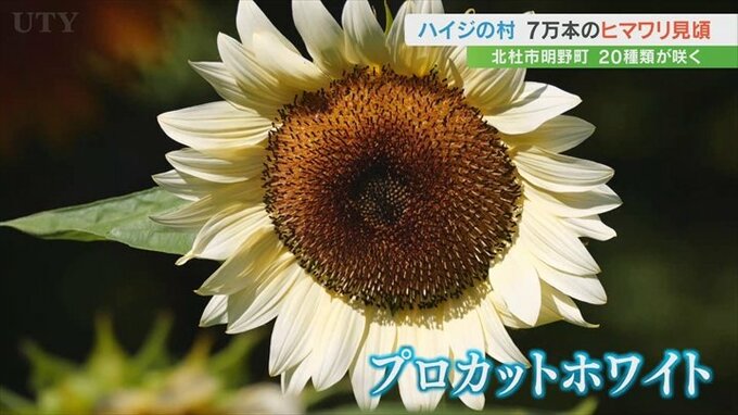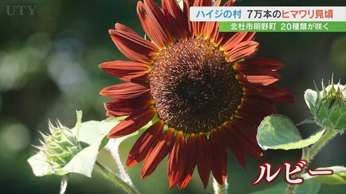 ヒマワリは黄色だけでなく赤い花びらの「ルビー」や、白い花びらの「プロカットホワイト」など20種類で、今がちょうど見ごろです。