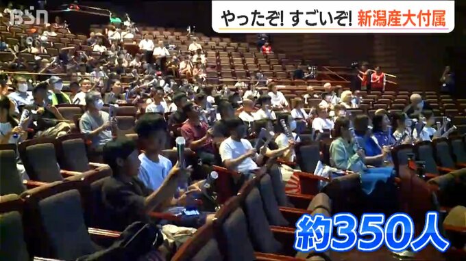 柏崎市のパブリックビューイング会場ではおよそ350人が集まり、声援を送ります。