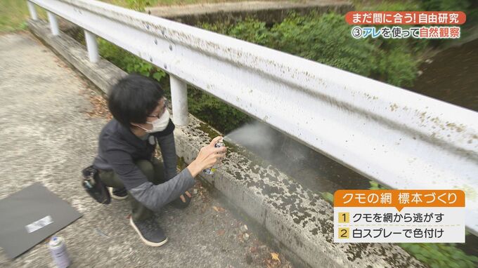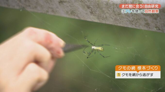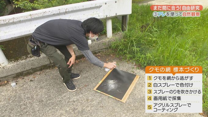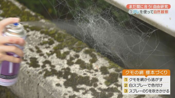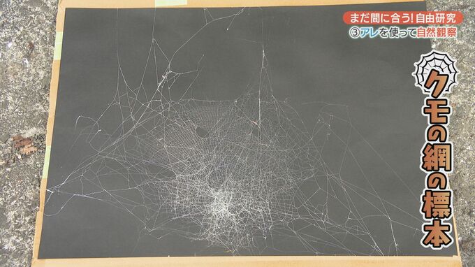 ⑤最後にアクリルスプレーでコーティングすれば、クモの網の標本の出来上がり。