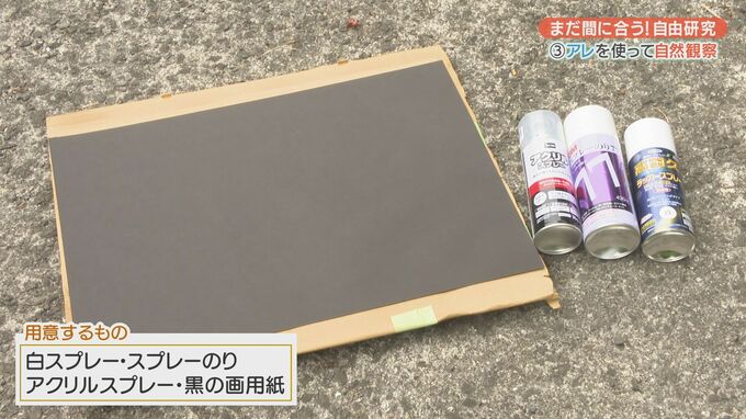 今回は、このクモの網を標本にします。用意するのは白のスプレーとスプレーのり、コーティングなどに使うアクリルスプレー、黒の画用紙です。