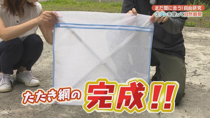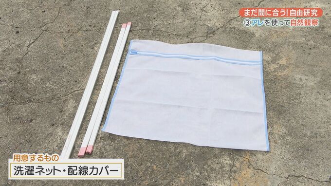 続いての観察で使うのは、洗濯ネットとコードの保護などに使う配線カバー。この2つの道具を使って虫を捕るためのたたき網を作ります。