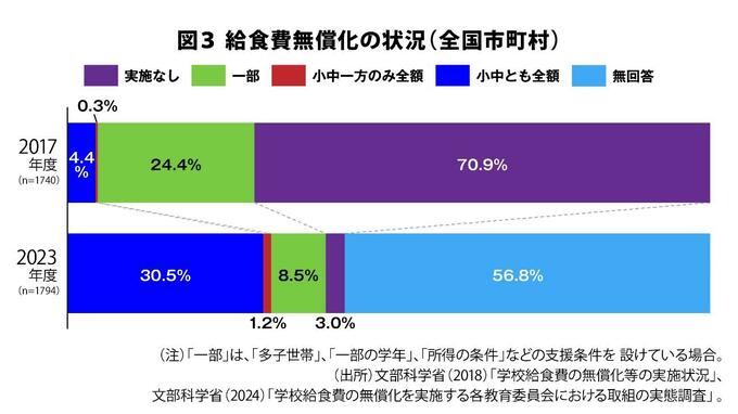 無償化の状況は、「小中とも全額」、「小中一方のみ全額」、「一部」に分類できる(図3)。「一部」は、多子世帯、一部の学年、所得などの条件を設けている場合が該当する。「実施なし」または「無回答」は、2017年度は全国の約7割、2023年度も約6割存在する。