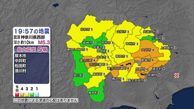 気象庁によりますと、震源地は神奈川県西部で、震源の深さはおよそ10km、地震の規模を示すマグニチュードは5.3と推定されます。