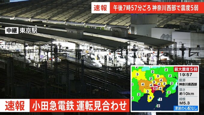 小田急電鉄によりますと、先ほどの地震による影響で小田急線は全線で運転を見合わせています。運転再開のめどは立っていないということです。東京メトロ千代田線との相互直通運転も中止しているということです。