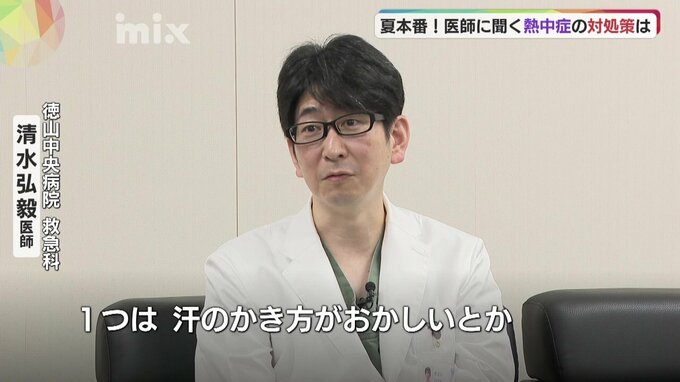 県のまとめによると、今月に入ってきのうまでに、熱中症の疑いで病院に搬送された人は364人。去年の同じ時期より67人増えています。徳山中央病院の清水弘毅医師は、1番の熱中症対策は自分や周りの人の体調の変化に気づくことだと話します。