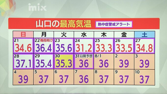 梅雨明け以降の山口の最高気温。毎日、30度以上の真夏日。7月31日以降は予想気温ですが、35度以上の猛暑日が予想され、8月2日からは39度の予想も。紫色の枠は、熱中症の危険性が極めて高くなるおそれがある「熱中症警戒アラート」が発表された日。7月21日以降、毎日発表されています。