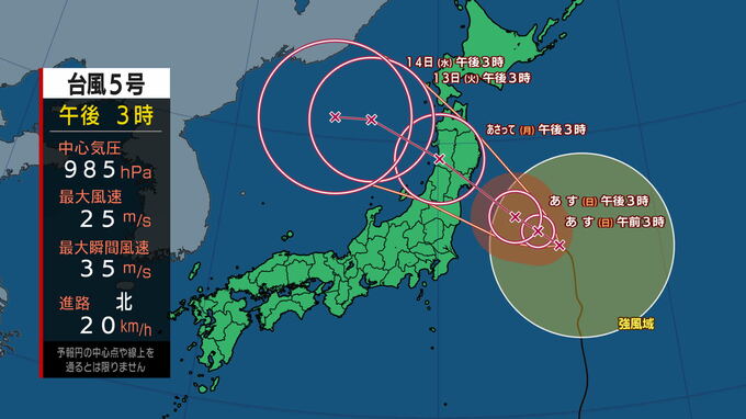 台風5号は、10日(土)午後3時現在日本の東にあって、北に20キロの速さで進んでいます。中心気圧は985ヘクトパスカル、中心付近の最大風速は25メートルです。今後進路を北西に変え、