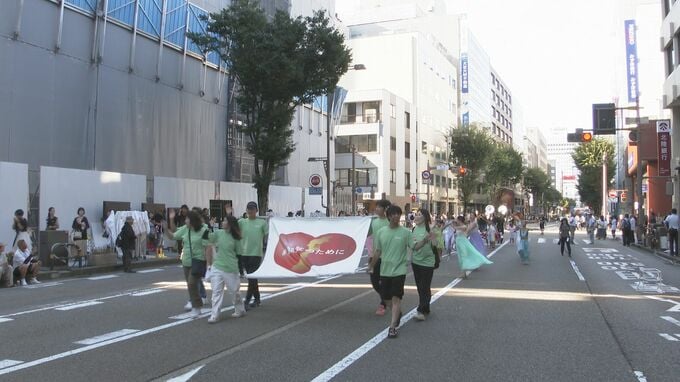 金沢ゆめ街道は午後4時から、金沢市中心部の国道157号の約1.5キロを歩行者天国にして行われています。オープニングを飾り、石川県珠洲市の飯田高校や緑丘中学校の吹奏楽部をはじめ、マーチングバンドの名門・京都橘高校吹奏楽部によるパレードが行われました。