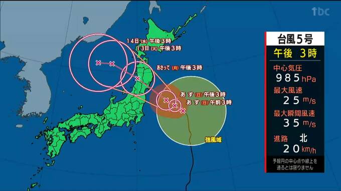 日本の東にある台風5号は、今後、北西に進み12日未明から朝にかけて、東北地方の太平洋側に上陸する見込みです。