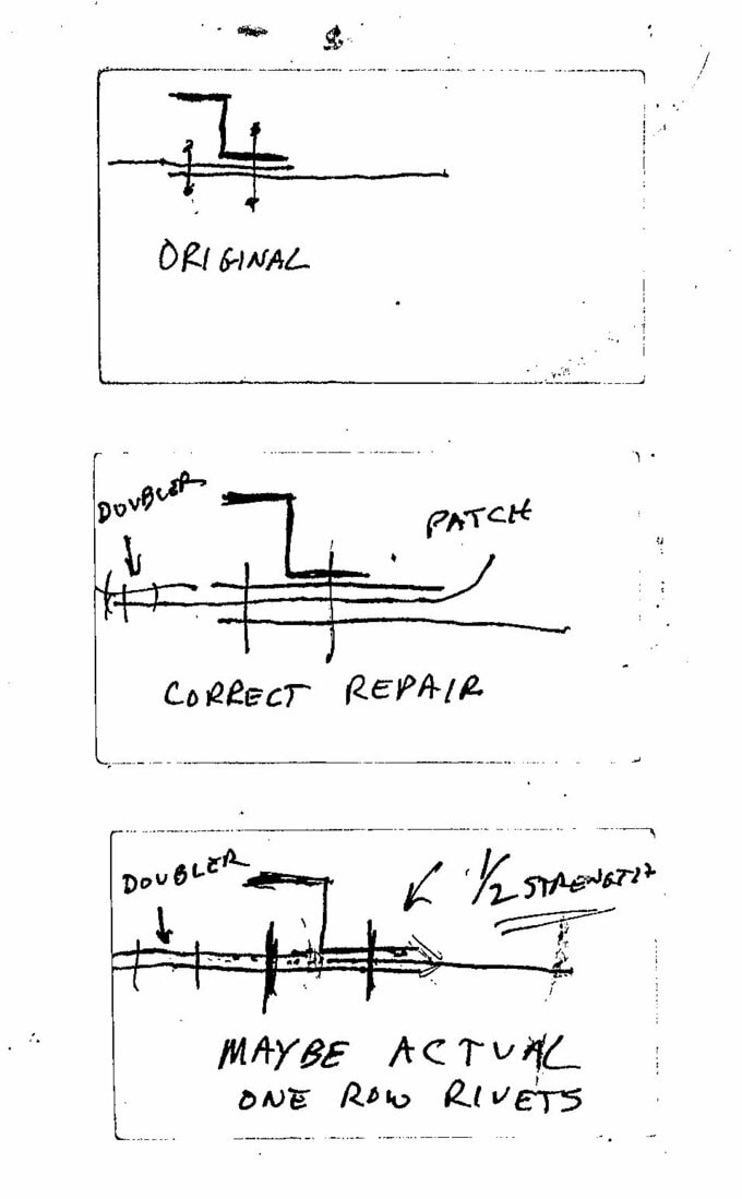 シュリード氏が描いた3つのイラストは、隔壁の断面を簡潔に示していた。1枚目は「正常な隔壁」2枚目は「正しく修理された場合の隔壁」そして3枚目に、事故機の隔壁の「継ぎ板」が途中で切れていることを“点線”で表現していた。