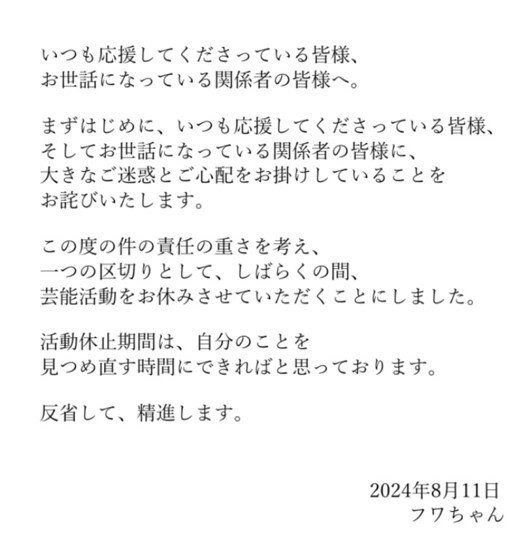 続けて「この度の件の責任の重さを考え、一つの区切りとして、しばらくの間、芸能活動をお休みさせていただくことにしました。」と、記しました。フワちゃんは「活動休止期間は、自分のことを見つめ直す時間にできればと思っております。」「反省して、精進します。」と、しています。