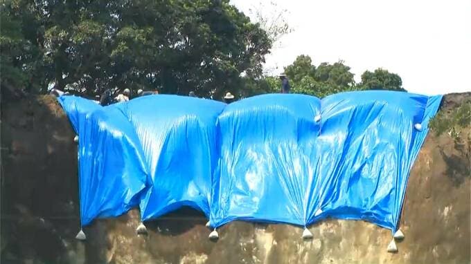 今月8日の日向灘を震源とする地震で、がけ崩れした志布志市の斜面をビニールシートで覆う作業が行われました。今月8日の地震で、鹿児島県内では最大震度5強を記録しました。この地震で、志布志市志布志町帖の大師…