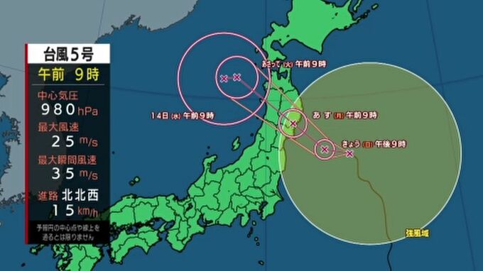 東北に上陸するおそれがある台風5号の影響で県内は11日から12日にかけて警報級の大雨になる見込みで、気象台は土砂災害や河川の増水などに厳重に警戒するよう呼びかけています。台風5号は次第に進路を西よりに変え…