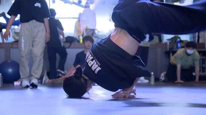 ブレイキンは、音楽に乗せて体のあらゆるところを使ったアクロバティックなダンススポーツで、技術や表現力などを競います。公開初日は基礎となるフィジカルトレーニングをみっちり、そして海外選手の試合映像を見てグループで感想を話し合うなど、合宿ならではの光景も。