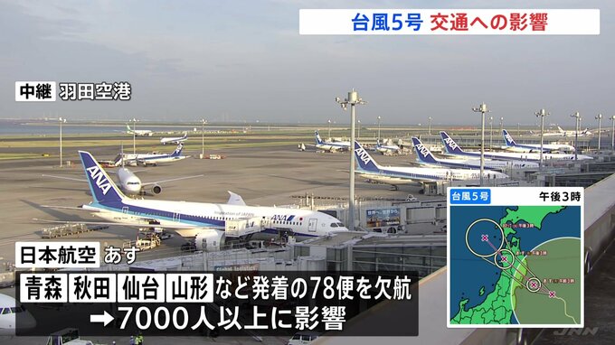 台風5号による交通への影響です。JR東日本によりますと、あす、東北、秋田、山形新幹線の上下線で、遅れや運休の可能性があるとしています。続いて空の便への影響です。全日空によりますと、きょう夜からあすにか…