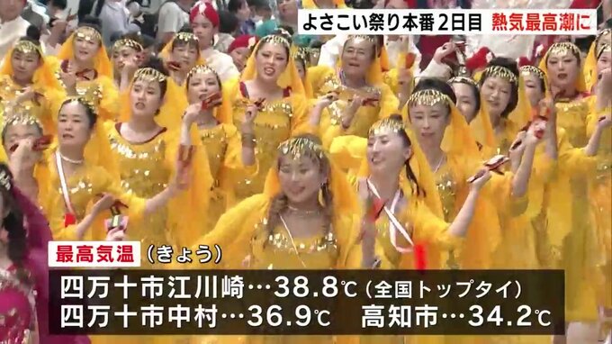 2024年のよさこい祭りにはおよそ1万7000人の踊り子が出場し、エネルギッシュな舞を披露しています。最高気温は高知県四万十市江川崎で全国トップタイの38・8℃を観測するなど厳しい暑さとなった本番2日目、踊り子たちの熱気は最高潮に達しています。