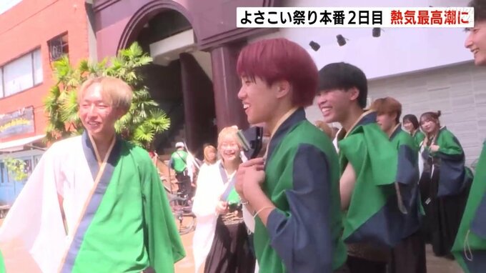 よさこい祭り本番2日目。厳しい暑さの中、踊り子たちの熱気は最高潮に達しています。
