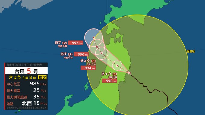 気象庁によりますと、台風5号は、12日4時には気仙沼市の南東にあって、1時間におよそ10キロの速さで西北西へ進んでいます。中心の気圧は980ヘクトパスカル、中心付近の最大風速は25メートル、最大瞬間風速は35メートルで、中心の北東側440キロ以内と南西側280キロ以内では、風速15メートル以上の強い風が吹いています。