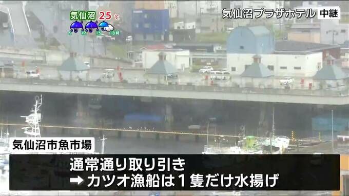気仙沼漁協によりますと魚市場は12日朝から通常通り取り引きを行っているということです。例年この時期は多くのカツオが水揚げされていますが台風の影響できょう水揚げしたカツオ漁船は一隻だけとなっていて入荷はかなり少ない状況だということです。