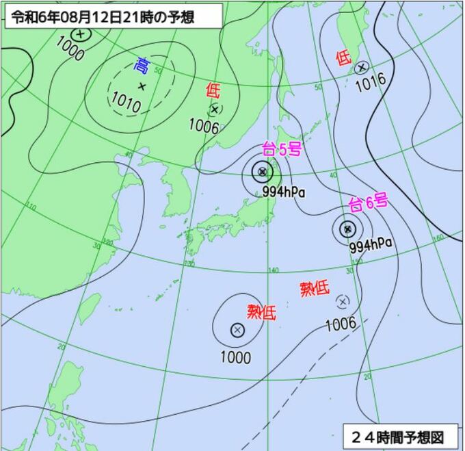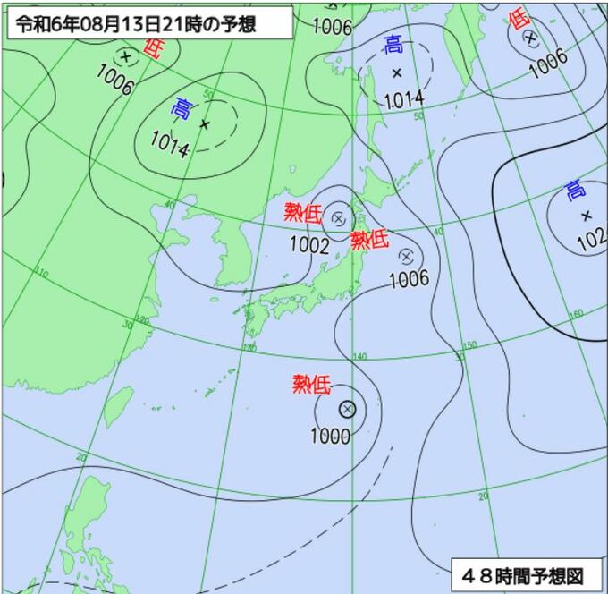 日本の南に「熱帯低気圧」新たに発生 24時間以内に「台風」へ発達する可能性 進路は? 発達しながら伊豆諸島近海へ進む見込み 山陰放送 2024年8月12日(月) 11:25 国内 続いて気象庁の天気図です。24時間予想図・48時間予想図もあわせてご覧ください。 気象庁HPより 気象庁HPより 気象庁HPより