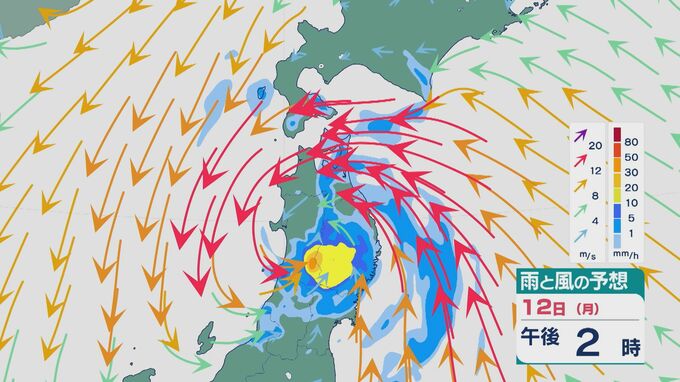 12日の雨と風の予想ですが、昼過ぎには東北地方北部の内陸部を中心に雨が激しくなっています。