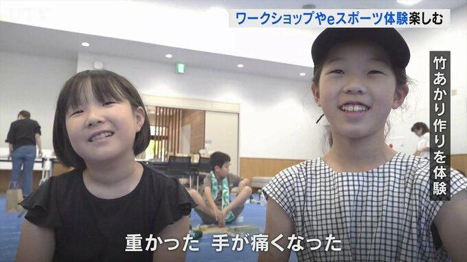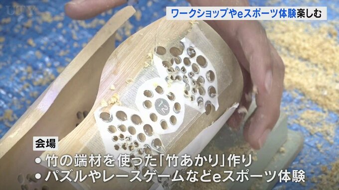 会場では、竹の端材に工具を使って穴をあけ、「竹あかり」を作るワークショップや、ハンドルで操作するレースゲームなどeスポーツ体験が行われ、大勢の家族連れが楽しみました。