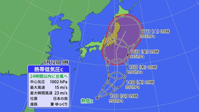 5日先までの進路予想図をみると、熱帯低気圧は発達しながら16日(金)には関東に接近し、最悪上陸するおそれもあります。またその後は北上を続け、北日本にも影響を及ぼす可能性があります。まだ予報円が大きく、予想にはブレがありますが、場合によってはお盆休みに台風が直撃し、交通機関などに影響がでるおそれがあります。