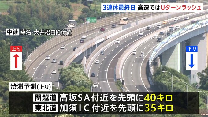 お盆期間の前半、3連休最終日のきょう、高速道路は東京方面=上りが混雑のピークとなっています。最大40キロの渋滞も予測されています。高速道路各社によりますと、午後1時20分現在、東名高速・上り、大和トンネル…