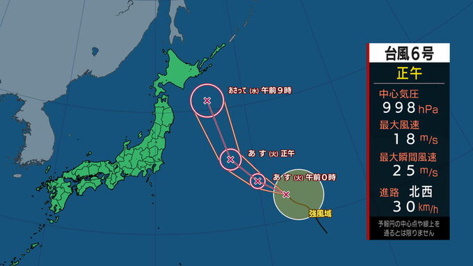 11日午後6時、南鳥島付近で発生した台風6号は、強風域を伴いながら北西に進んでいます。今後三陸沖付近まで北上しますが、ほとんど発達することなく、14日午前9時までには再び熱帯低気圧に変わる見込みです。現時点で、陸上への影響は少ないとみられますが、太平洋沿岸の地域では、台風6号によるうねりが到達する見込みですので、注意が必要です。