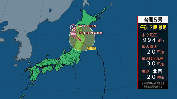 12日午前8時半頃に岩手県大船渡市付近に上陸した台風5号は、北西に進んでいて、13日にも日本海北部で熱帯低気圧に変わる見込みです。宮城県からは次第に遠ざかっていて、陸上に出されていた暴風警報と、海上の波浪警報は、すでに注意報に切り替えられるなど、影響は小さくなってきています。