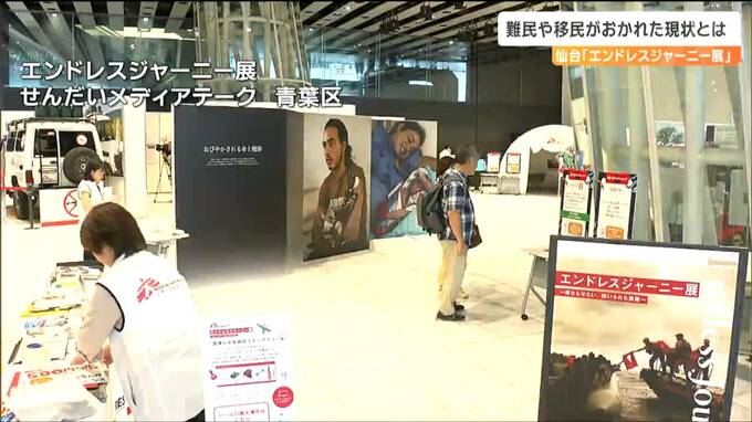 青葉区のせんだいメディアテークで始まった「エンドレスジャーニー展」。世界の紛争地や貧困地域で医療援助活動を行っている国境なき医師団が難民や移民の現状を知ってもらおうと開いたもので東北では初めての開催です。