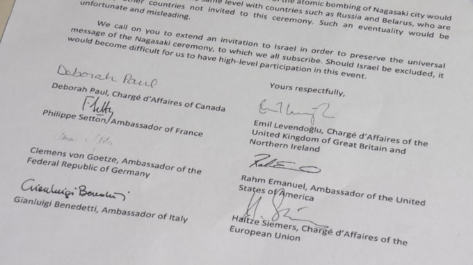 アメリカ・イギリス・カナダ・フランス・ドイツ・イタリア・欧州連合(EU)の大使は、市が判断を保留していた7月中旬、「イスラエルを招請しないことはロシア・ベラルーシと同等にみなすことで誤った印象を与えることになる」「イスラエルが除外された場合、ハイレベルの参加者を派遣することが難しくなる」とする書簡を市に送り、イスラエルを招待するよう市に迫りました。