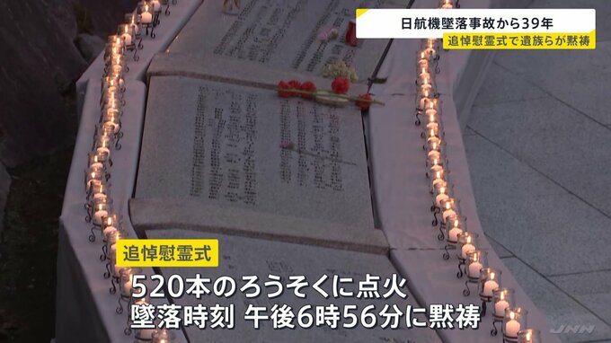 520人が犠牲となった日航機墜落事故からきょうで39年。追悼慰霊式で遺族らが黙祷を捧げました。墜落現場となった御巣鷹の尾根のふもとで行われた追悼慰霊式では、520本のろうそくに火が灯され、墜落時刻の午後6時5…