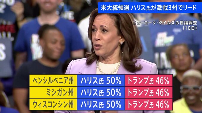 アメリカ大統領選の勝敗を左右するとみられている激戦州のペンシルベニア州、ミシガン州、ウィスコンシン州の3つの州で、ハリス副大統領の支持率が50%と、トランプ前大統領をいずれも4ポイント上回りました。バイ…